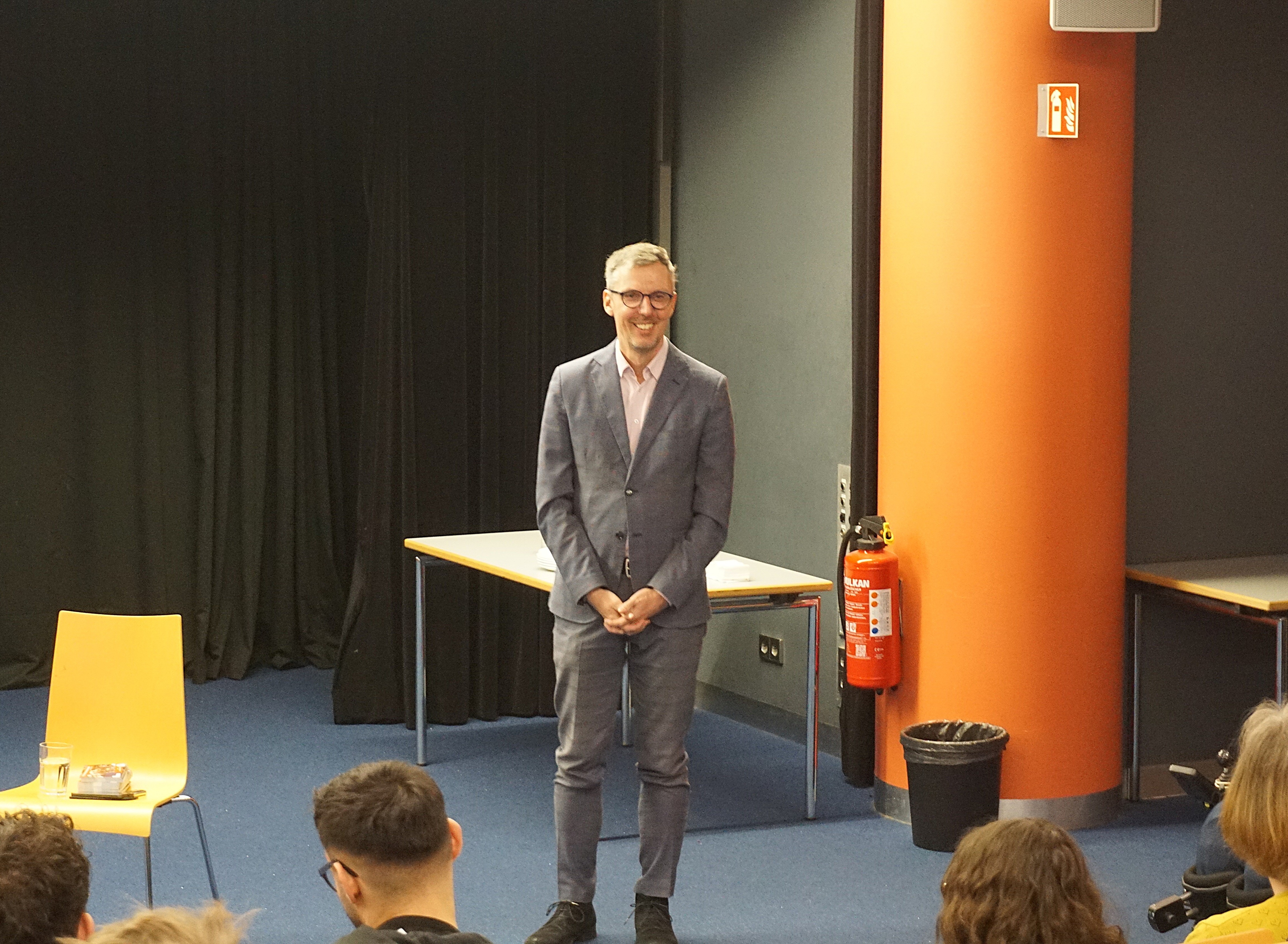 In seiner Begrüßung bezeichnete Castellucci die SRH Stephen-Hawking-Schule als einen „besonderen Ort“. Er sei bereits früher zu Gast bei den SRH Schulen gewesen und habe bewusst Veranstaltungen hier stattfinden lassen, um zu zeigen, dass Orte wie diese keine Selbstverständlichkeit seien. Für ihn sei es entscheidend, mit Menschen im Gespräch zu bleiben – gerade mit jungen, denn Politik lebe vom Austausch, nicht von Distanz.