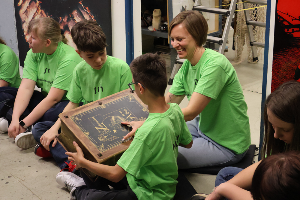 Foto 2: Hinter den Kulissen: Team Frösche bewundert die spannenden Requisiten.