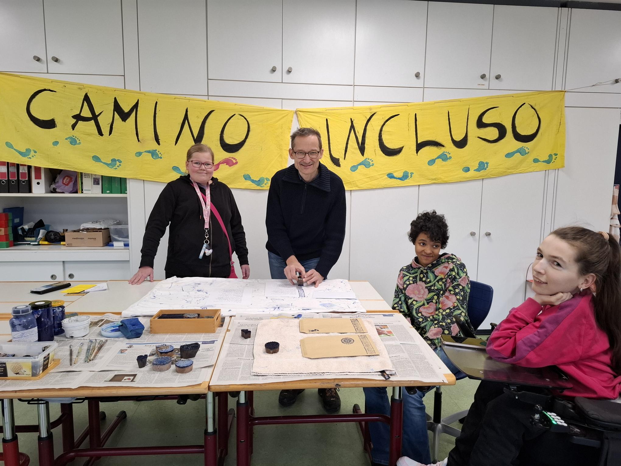 Bei seinem Besuch an der SHS wurde Herr Katzenstein von den Schüler:innen in die Pilgerwerk-statt der SHS begleiten, wo er, umgeben von Karten, Werkzeugen, selbst gestalteten Materialien und der konzentrierten Energie der Schüler:innen, ins Staunen geriet. Hier, wo Faltlinien für Pilgerpässe gezogen, Stempel gesetzt, Gelände vermessen und inklusive Ideen geboren werden, begann für ihn eine Reise, die ihn sichtlich berührte.
