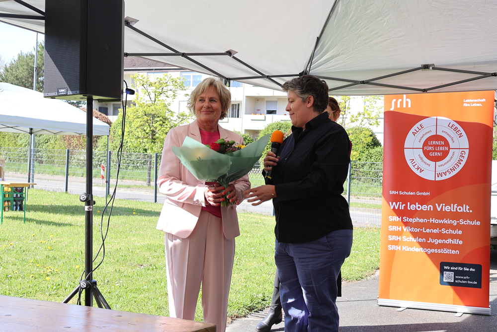 Foto 3: Ein Blumenstrauß für Bettina Heskamp, Abteilungsleitung teilstationäre Jugendhilfe.