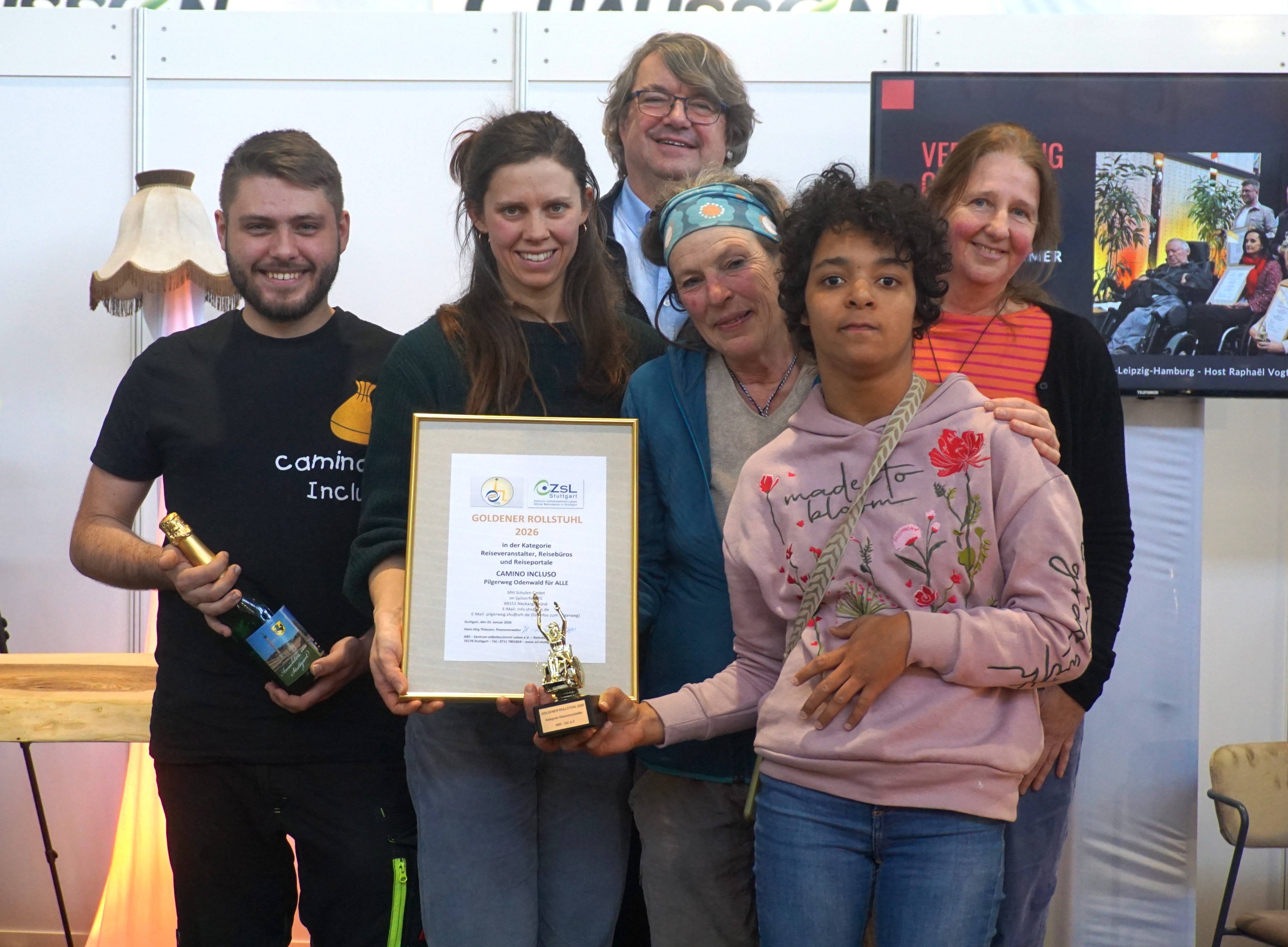 Zwischen Wohnwägen, Reisegewinnspielen und Campingausstattung fand auf der CMT-Urlaubsmesse in Stuttgart kürzlich eine ganz besondere Veranstaltung statt—und die SRH Stephen-Hawking-Schülerin Marlene war mittendrin. Denn die „Aktive Behinderte Stuttgart – das Zentrum selbstbestimmt Leben e.V.“ (ABS ZsL) zeichnete mit dem „Goldenen Rollstuhl“ herausragende Angebote im barrierefreien Tourismus aus. Geehrt wurde dieses Jahr in der Kategorie „Reiseveranstalter“ auch der Camino Incluso, ein barrierearmer Komfortwanderweg im Naturpark Neckartal-Odenwald, an dessen Entstehung die Schüler:innen und Lehrkräfte der SRH Stephen-Hawking-Schule (SHS) federführend waren. Gemeinsam mit ihren Lehrer:innen und dem ehemaligen SHS Schüler Fabian reiste Marlene nach Stuttgart, um voller Stolz die Auszeichnung im Namen der SHS entgegen-zunehmen.