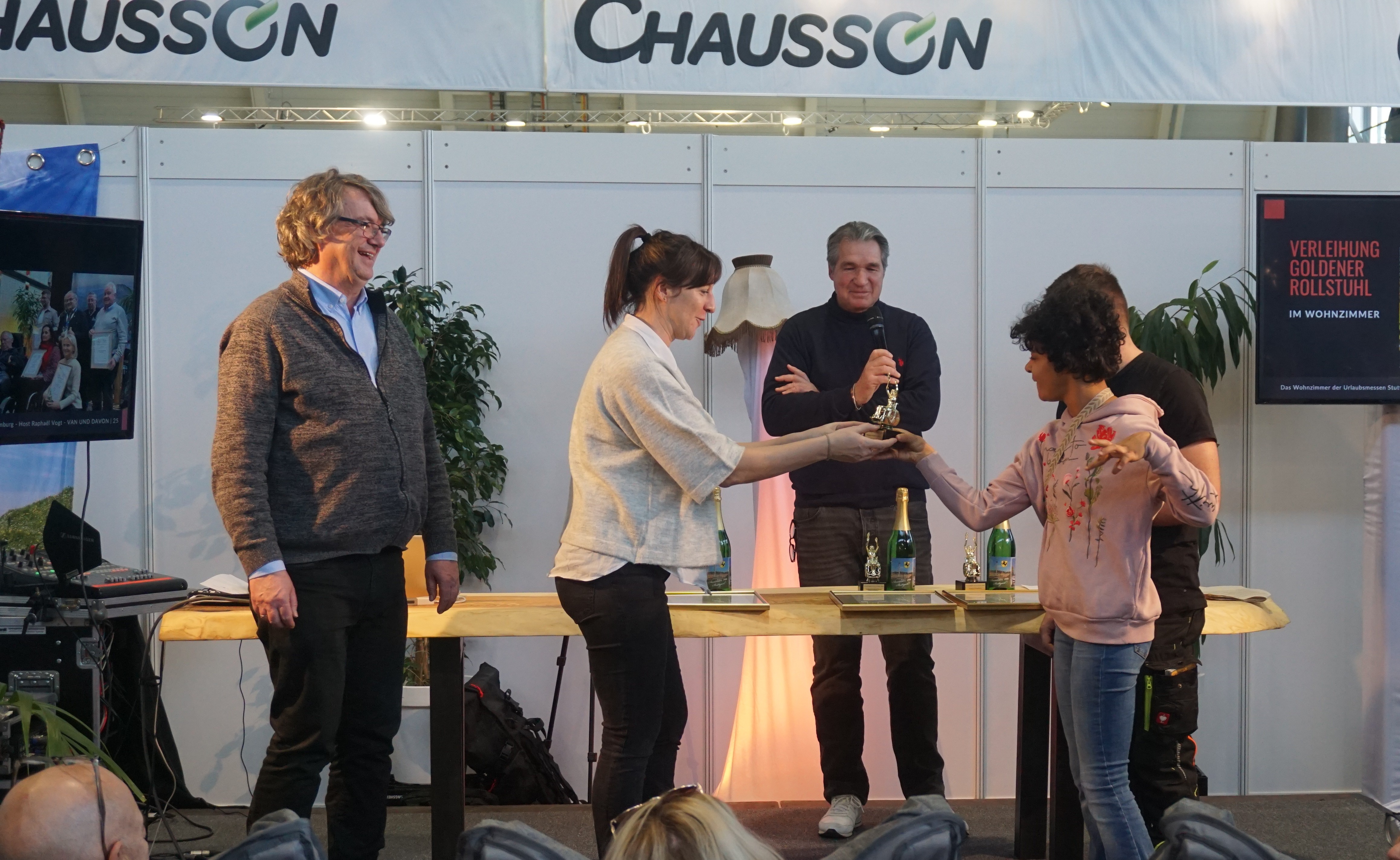 Foto 3: Marlene nimmt stolz den Goldenen Rollstuhl entgegen.